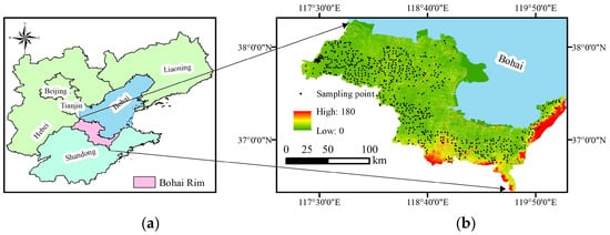 Soil salinization is a form of land degradation caused by natural or human activities [1]. About 8.31 × 108 hm2 of soil in the world is threatened by salinization [2]. With the continuous impact of global climate change and human activities, the land area affected by salt is expanding [3]. At the same time, the world has been on the verge of a serious food crisis for the past 50 years [4]. In 2021, the number of hungry people resulting from the worldwide food shortage reached 828 million, 46 million more than that in 2020 [5]. Under the influence of the global COVID-19 pandemic and the locust plague in Africa, the number of hungry people in the world may further increase[6,7]. The total area of salinized soil with utilization potential in China is about 3.6 × 107 hm2, accounting for 4.88% of the nationally available land area [8]. This has seriously affected our ability to realize the goal of increasing grain production, farmers’ income, and the sustainable utilization of resources throughout the country. Therefore, the comprehensive utilization of salinized land is of great strategic significance to ensure national food security. The low plain area around the Bohai Sea has been the main battlefield for the development and utilization of salinized land in China in recent years, and it is also the focus of social and academic attention [9,10]. For two consecutive years, from 2015 to 2016, the “No. 1 Central Document” proposed the “implementation of scientific and technological projects for high grain yield and scientific and technological demonstration of saline alkali land transformation” and to “implement the scientific and technological demonstration project of the Bohai granary, increase scientific and technological support, and accelerate the transformation of saline alkali land” [11]. However, due to the shortage of freshwater resources, less precipitation with uneven temporal and spatial distribution, frequent and abnormal droughts and floods caused by climate anomalies, poor saline–alkali land, and urbanization occupation [11], the amount and quality of the cultivated land in the Bohai Rim region have changed greatly in temporal and spatial distribution. In addition, the stability and sustainability of cultivated land productivity have been seriously threatened. It is an urgent task to determine the spatial and temporal change characteristics of cultivated land in salinized areas, the changing trend in the productivity of salinized cultivated land, and the quantitative relationship between the degree of salinization and productivity of cultivated land. This is of great significance for the sustainable development of coastal agriculture, food security, and achieving the goal of zero growth in land degradation [12].