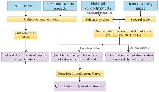 Our main research objectives are as follows: (1) analyze the temporal and spatial characteristics of soil salinization and NPP of cultivated land in the Shandong region around the Bohai Sea from 2001 to 2019 and (2) quantitatively express the influence of soil salinization on cultivated land productivity. Our study aims to elucidate the impact of salinity on cultivated land productivity by analyzing the spatial and temporal dynamic characteristics of salinity and NPP of the cultivated land and to provide support for using quantitative measures to regulate salinity, improve farmland productivity, and alleviate food security problems.