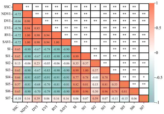 Correlation between soil salt content and the spectral index. “*” indicates that variables are significantly correlated (p < 0.05). “**” indicates that variables are significantly correlated (p < 0.01).