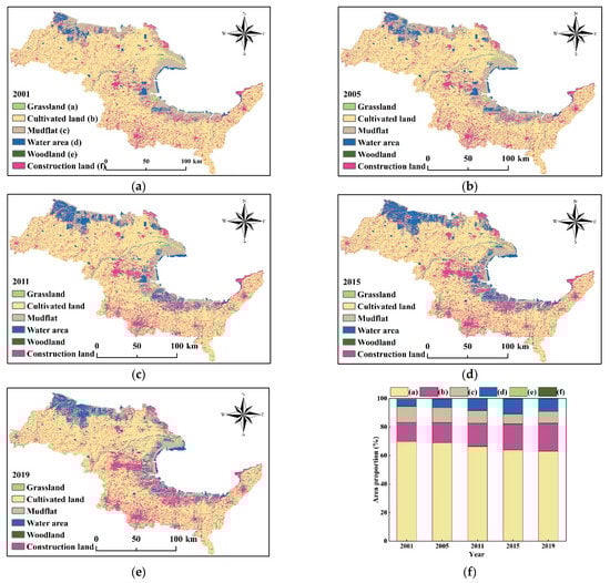 Spatial distribution of land use types in the Shandong area around the Bohai Sea from 2001 to 2019. (a–e) represent the distribution of land use types in the study area in 2001, 2005, 2011, 2015 and 2019 respectively. (f) shows the percentage of area of different land types in different years.