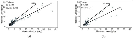 The 2019 sample data were divided into a training set and a verification set in a ratio of 7:3, and the inversion model was established using the random forest method. The results are shown in Figure 5. The training set’s R2 was 0.833 and RMSE was 1.982 g/kg. The validation set’s R2 was 0.714, and the RMSE was 2.134 g/kg. The training set and validation set had good modeling effects, which were used for the inversion of soil salt content in the study area.