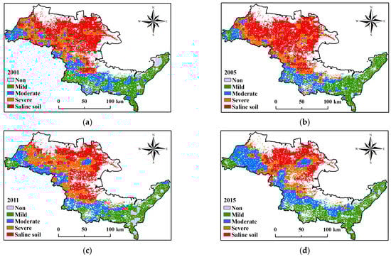 Using this model, the soil salt contents of the cultivated land in the Shandong region around the Bohai Sea in 2001, 2005, 2011, and 2015 were inversed, respectively. According to the type of salinization degree, a spatial distribution map was drawn, and then the area and proportions were counted. The results are shown in Table 4 and Figure 6.