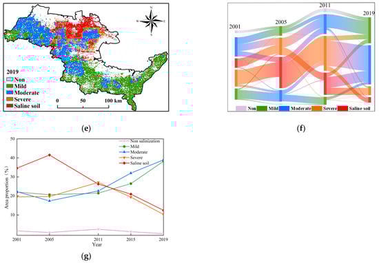 Spatial distribution and area proportion for the cultivated land salinization in the Shandong area around the Bohai Sea from 2001 to 2019. Note: (a–e) show the spatial distribution of soil salinity in different years from 2001–2019, (f) shows the area transfer Sankey diagram for different years, and (g) shows the change in area proportion.
