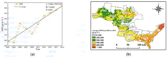 Spatio-temporal characteristics of the NPP of cultivated land in the Shandong area around the Bohai Sea from 2001 to 2019. Note: (a) Interannual change in the average NPP of regional cultivated land and (b) spatial distribution of the average NPP in 2001–2019.