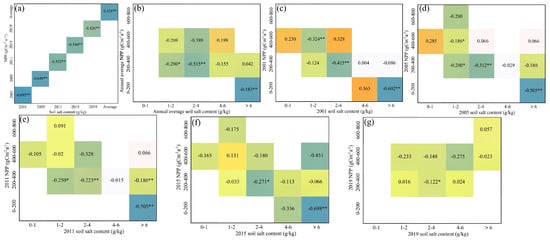 Spearman correlation coefficient between the soil salt content and NPP of cultivated land. (a) shows the correlation between NPP and soil salt content in different years. (b) Denotes the correlation between annual average NPP and soil salt content. (c–g) Correlation between NPP and soil salt content in 2001, 2005, 2011, 2015, and 2019, respectively. Note: “*” indicates that variables are significantly correlated (p < 0.05). “**” indicates that variables are significantly correlated (p < 0.01).