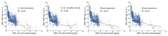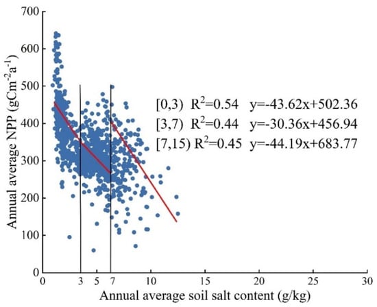 In order to perform a quantitative analysis of the soil salt content and NPP, three intervals of 0–3 g/kg, 3–7 g/kg, and 7–15 g/kg were finally selected to achieve piecewise fitting using the power function regression model, considering the difference in slope change and the fitting degree of the piecewise linear regression. The results are shown in Figure 10. In summary, when the salt content of the cultivated soil was in the range of 0–3 g/kg, the fitting accuracy R2 was 0.54, and the fitting effect was the best. For every 1 g/kg increase in salt content, the NPP value was predicted to decrease by 43.62 gC m−2a−1. When the soil salt content of the cultivated land was in the range of 3–7 g/kg, the fitting accuracy R2 was 0.44. For every 1 g/kg increase in salt content, the NPP value was predicted to decrease by 30.36 gC m−2a−1. When the soil salt content of the cultivated land was in the range of 7–15 g/kg, the fitting accuracy R2 was 0.45. For every 1 g/kg increase in salt content, the NPP value was predicted to decrease by 44.19 gC m−2a−1.