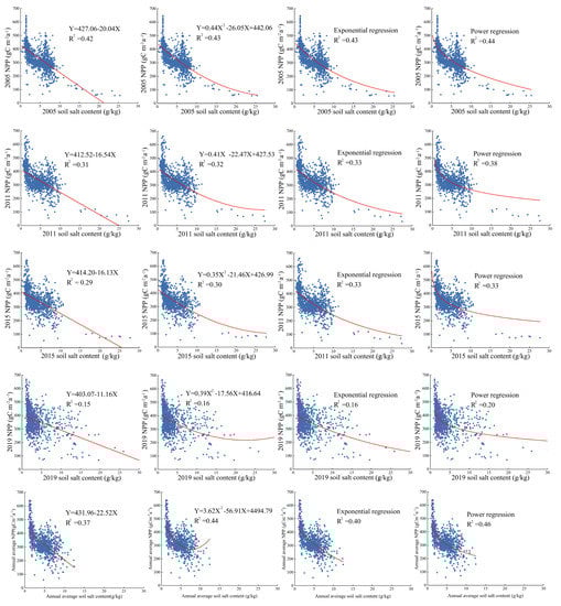 The fitted results for the NPP values and soil salt content of cultivated land in different years are shown in Figure 9. During this study, the R2 for the fitted nonlinear function results were higher than the fitted linear function results, indicating that the correlation between them was not purely linear. For 2001, 2005, 2011, 2015, 2019, and the multi-year average, the R2 values of the curve for the fitted models were 0.06–0.12, 0.01–0.02, 0.01–0.07, 0.01–0.04, 0.01–0.05, and 0.03–0.09 higher than that of linear fitted models, respectively. For the curve fitting models, the power function regression model was the best. In summary, the precision of different fitting regression models had advantages and disadvantages, but their overall trends were roughly the same, showing a trend that the NPP value gradually decreased with the increase in the soil salt content of the cultivated land.