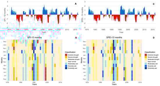 Results of SPI (A,B) and SPEI (C,D) for 12 months and its classification following values of Figure 1 and (B–D). (A,C) Dry values are showed in red and wet values are in blue.