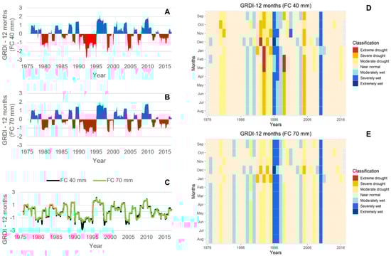 Figure 3. (A–E) Results of GRDI for two different field capacities or FCs of 40 and 70 mm (A,B). (C) shows the differences between both results of GRDI. Classification of GRDI results (D,E). Blue and red above and below zero, respectively.