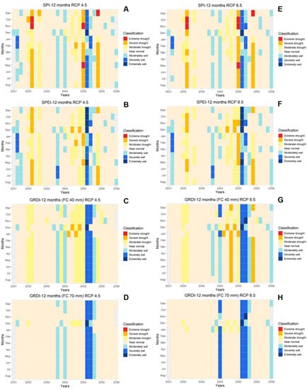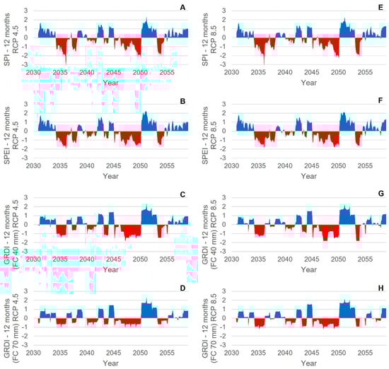 (A–H) Results of the indices SPI, SPEI, and GRDI for future simulations in scenarios RCP 4.5 (A–D) and RCP 8.5 (E–H). Blue and red above and below zero, respectively.