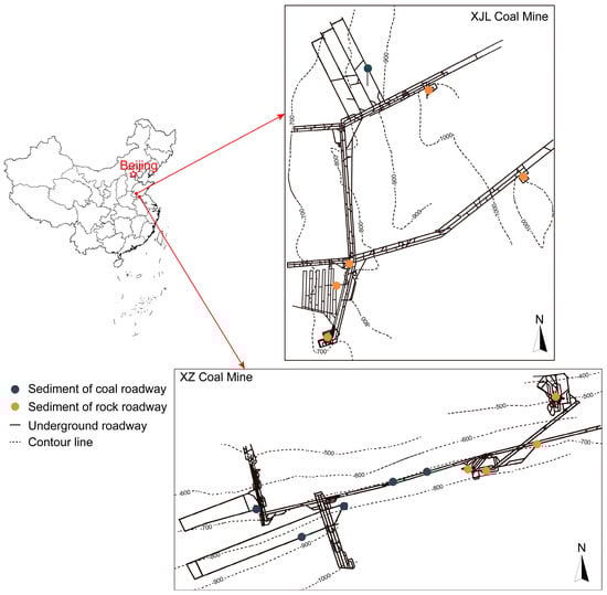 In January 2022, nine sediment samples (D1~D9) were collected underground at the depth of −400 m~900 m in XZ Mine, and six sediment samples (X1~X6) were collected underground at the depth of −700 m~1000 m in XJL Mine (Figure 1). Coal mining has been operated for almost 40 years at the XZ Mine and about 20 years at the XJL mine. The sampling locations and descriptions of sediment samples are shown in Table 1. In order to ensure the safety of the underground workers, the coal mining environment is usually under negative pressure ventilation, especially in the vicinity of the working face of the coal roadway. Most underground activities are carried out close to the coal roadway or workface, with the rock roadway being used mainly for hauling personnel and materials.