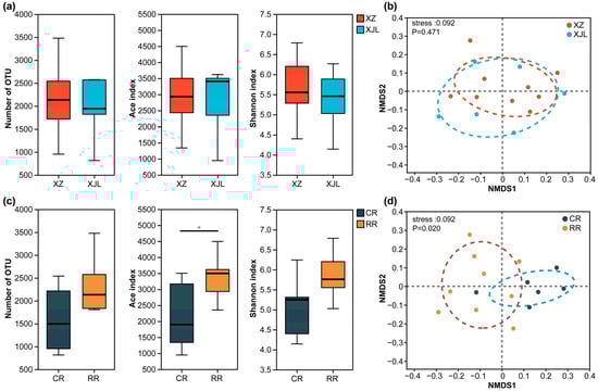 Comparison of alpha diversity indices of sediment from XZ and XJL mines (a). Beta diversity analysis of sediment from XZ and XJL mines (b). Comparison of alpha diversity indices of CR and RR group samples (c). Beta diversity indices of CR and RR group samples (d). (* p < 0.05)