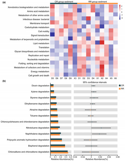 To investigate the functions of the microbial community in coal mine sediment, we used Tax4Fun, a metabolic function prediction method using SILVA as a reference database [26]. The prediction of the sediment obtained 6 level 1 functions and 41 level II functions. A total of 18 level II functions had relative abundances >1% (Figure 6a), which mainly included carbohydrate metabolism, amino acid metabolism, membrane transport, signal transduction, and energy metabolism, etc. Among them, the relative abundance of the top 11 functions together exceeded 80%. Statistical analysis showed that the CR samples were significantly different from the RR samples in the functions of membrane transport, metabolism of other amino acids, and folding, sorting, and degradation (p < 0.05). The enhanced membrane transport and other amino acid metabolic functions of microorganisms in the underground environment of the coal roadway may be an adaptation mechanism of microorganisms to the underground coal mine environment. In addition, the microorganisms of the RR samples were enhanced in translation, replication and repair, nucleotide metabolism, folding, sorting, and degradation compared with the CR samples. RR samples had a relatively high content of heavy metals, which were toxic to bacterial cells. Therefore, microorganisms in RR samples evolved effective repair functions by accelerating replication and reproduction to adapt to the external environment [52]. As we observed, the cell growth and death function were also highly expressed in RR sediment.
