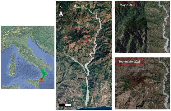 Figure 1. The study area located within the territory of Aspromonte Massif, Metropolitan Area of Reggio Calabria, Southern Calabria, Italy. Satellite imagery provided by Google Earth Pro shows the study area (red circle) before and after the wildfire that occurred in August 2021 (territory of Roccaforte del Greco).