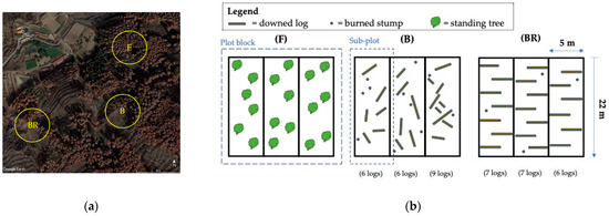 Figure 2. (a) Location of the three plot-blocks in Roccaforte del Greco, Southern Calabria, Italy; (b) experimental sketch showing the three conditions studied: F, forested; B, burned with casually directed downed logs; BR, burned rearranged with manually redirected downed logs along contour lines.