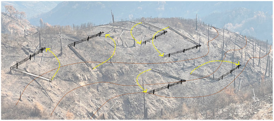 Figure 3. Sketch of the manual redirection along the contour lines (brown lines) and hammering of downed burned logs (dashed yellow lines indicate the rotation of logs).
