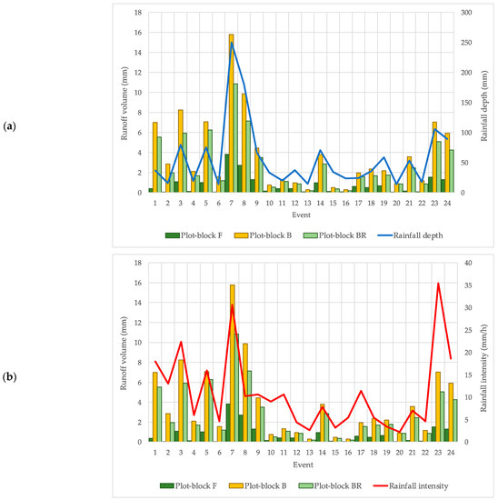 Furthermore, differences in runoff volume were observed among plots across all ranges of rainfall, highlighting the strong correlation between runoff and rainfall volume (Table 6). On the other hand, rainfall intensity only provided differences in all plots within the 0–10 mm h−1 range. Beyond that range, the runoff data recorded in plots B and BR dd not show significant differences, except for plot F at rainfall intensities above 30 mm h−1. This finding can be explained by the interception effect of the canopy cover as well as by the wetting processes of the vegetation, which can store significant volumes of rainfall. The decrease in runoff occurs at low rainfall intensities, whereas lower vegetation coverage at higher rainfall intensities decreases the water retention effect [74].
