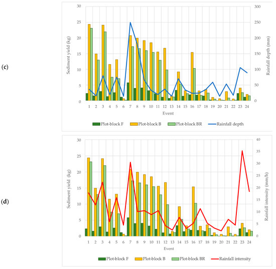 Nevertheless, the absolute highest sediment value (2.434 kg corresponding to 0.022 kg m−2, plot B) was recorded after event no. 1, despite its relatively moderate characteristics (36.4 mm, 18.0 mm h−1). This event occurred immediately after the wildfire when the ground was completely bare. For the same events, slightly lower values of runoff volume and sediment yield (33% ± 12% and 76% ± 80% on average, respectively) were observed in plot-block BR.