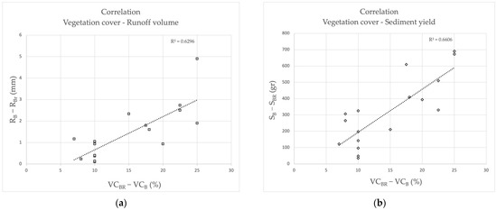 The positive effects of the vegetation were quantified by correlating the differences in vegetation cover (VCBR − VCB) with those of runoff volume (RB − RBR) and sediment yield (SB − SBR) for each rainfall event group. The analysis showed that the increased stage of vegetation cover in the BR plots contributed to the reduction in both runoff volume (R2 = 0.63) and sediment yield (R2 = 0.66) (Figure 5).