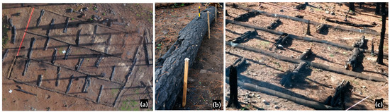 Scheme 2. (a) Overall view of the BR sub-plots under construction (in orange, plastic gutters), (b) view of the burned log hammering, and (c) rearranged burned sub-plots (BR).