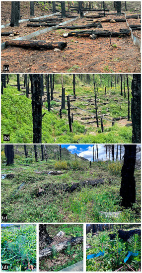 This observation highlights the positive control action of the redirected contour logs, which stabilize the slope and promote the rapid colonization of herbaceous vegetation (Rubus ulmifolius L., Pteridium aquilinum L., Cytisus villosus L., Lolium sp. pl., Hypochaeris achyrophorus L., Hypochaeris laevigata L., Geranium robertianum L., and Myosotis arvensis L., as indicated by their abundance–dominance value). This vegetation quickly protects the soil after the fire. This propitious action creates favourable conditions for the auto-regeneration of the wood, as demonstrated by the presence of young pine seedlings (Scheme 3d).