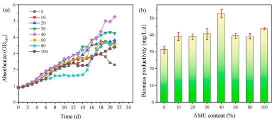 The properties of microalgae growth in cultures with different AME contents were firstly explored. Microalgal biomass (in terms of OD680) increased with cultivation time and exhibited different tendencies under different MW/AME ratios (Figure 1a). During the first 2 days, the OD value in all reactors slightly increased from 0.9 to 1.1, which might be due to the fact that microalgae need time to acclimate to the growth conditions [34]. Thereafter, the OD value in all reactors gradually increased, indicating that MW and AME can be utilized as nutrient sources for microalgae cultivation after a short-term adjustment.
