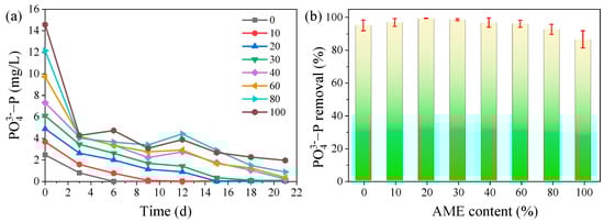 Variations in phosphate content (a) and removal efficiency (b) under different AME contents during microalgae cultivation.