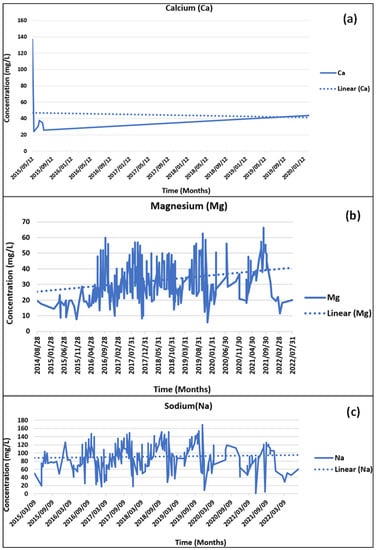 Trend analysis of calcium (a), magnesium (b), and sodium (c) from 2015 to 2022 across the study area.