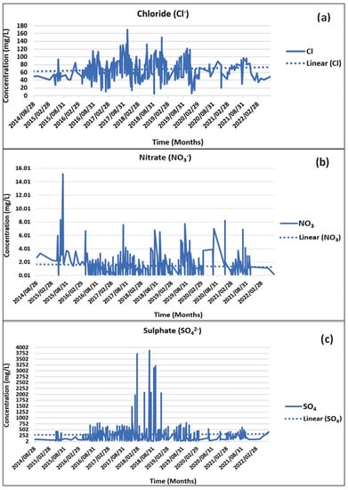 Trend analysis of chloride (a), nitrate (b), and sulphate (c) from 2015 to 2022 across the study area.