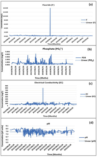 Trend analysis of fluoride (a), phosphate (b), electrical conductivity (c), and pH (d) from 2015 to 2022 across the study area.
