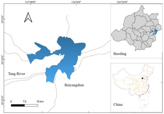 Baiyangdian Lake (113°39′ E~116°12′ E, 38°3′ N~40°4′ N) is a shallow grassy lake in the hinterland of Beijing, Tianjin, and Baoding (Figure 1). This lake’s total surface area is 366.0 km2, and the annual average evaporation of the Baiyangdian Basin is 1500–2000 mm. The terrain of this basin is high in the west and low in the east, with mountains, hills, and plains in turn, of which the plain area accounts for 47%. The land use of this basin is diverse, mainly cultivated land, forest land, and construction land. As the largest freshwater lake on the North China Plain, Baiyangdian Lake has a suite of critical ecological functions, such as flood control, climate regulation, water storage, fishing, reed production, provision of a touristic landscape, and protection of biodiversity [2].