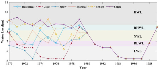 In the first scenario type, the historical drought sequence remains the same, and the preceding water level sequence is obtained via random sampling of the long historical water level data. Preceding water level sequences of different scenarios are constructed by calculating the 10-year moving average of historical water level data [20]. For example, periods with a ‘low’ state of the 10-year moving average are selected to represent the ‘2low’ scenario. For the baseline scenario (1historical), the preceding water level sequence was the same as its historical state.
