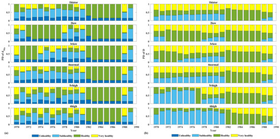 However, some exceptions did occur when lake vegetation diversity was assessed using D. The number of years with a very healthy status is quite high, and the annual probability is large under the 2low, 3rlow, and 4normal scenarios. Yet, as the water level rises, the number of years distinguished by a very healthy status declines and the annual probability becomes smaller. The Simpson index is used to evaluate the degree of species dominance [34]. When the water level state improves, more of the aquatic vegetation can grow vigorously, and the dominance degree of various aquatic species is roughly equivalent under a certain water level. It makes aquatic vegetation suitable for high water levels have a relatively lower dominance degree. For D, H, and J, the probabilities of reaching a very healthy status do not always increase with rising water levels; rather, the probabilities of a sub-healthy status increase instead, especially so for the 5rhigh and 6high scenarios. This demonstrates that maintaining a higher water level does not necessarily lead to improved aquatic vegetation diversity. It follows that there likely exists a certain appropriate range of water level favorable for the overall growth of aquatic vegetation.