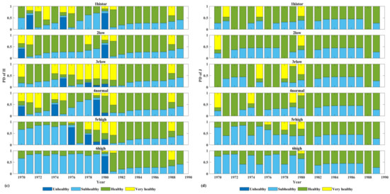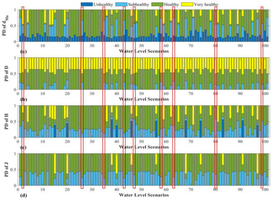 It is evident that the PDs of very healthy status for D are the greatest (Figure 5b), while the PDs of an unhealthy status for dMa are the greatest (Figure 5a) overall among the four diversity indexes. Hence, D has a better evaluation while dMa has a worse evaluation of aquatic vegetation diversity. The responses of dMa and J to the water level process are thus different, a finding consistent with the work of Filstrup et al. [45], showing that an ecosystem may respond differently to species richness and evenness. The reason for the discrepancy found is that the Margalef index focuses on evaluating the richness of aquatic vegetation, while Pielou’s index focuses on evaluating the uniformity of aquatic vegetation’s distribution in the ecosystem. Comparing 100 stochastically generated scenarios with the 1histor scenario in Figure 6, when evaluated according to the dMa, D, and H indexes, the historical scenario has less vegetation diversity, and vice versa for the J index. Collectively, these results suggest that aquatic vegetation diversity responds differently to water level processes, which are also consistent with the work of Filstrup et al. [45].