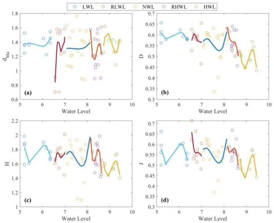 Figure 7. Responses of the four diversity indexes to each water level state. (a) the Margalef index, dMa; (b) Simpson index, D; (c) Shannon–Wiener index, H; (d) Pielou’s evenness index, J. (Circles represent the observed values; lines represent the simulated values.).