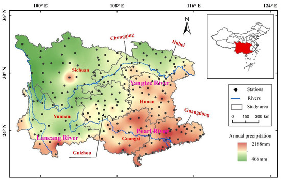 This study mainly focuses on the 8 provinces in southern China with widely distributed karst landforms, which cover the provinces of Yunnan (YN), Guizhou (GZ), Sichuan (SC), Chongqing (CQ), Hunan (HN), Hubei (HB), Guangdong (GD), and Guangxi (GX). It has a total area of 107.1 × 104 km2 and is situated at 97°–117° E, 20°–35° N. The topography is high in the southwest and low in the northeast and crosses a plateau mountain and subtropical monsoon and tropical monsoon type areas, which are complex in terms of landform and climate conditions (Figure 1). The annual rainfall is unevenly distributed, and most rainfall events are concentrated in summer [14]. According to the China Water and Soil Conservation Bulletin in 2020, the water erosion of the study area is approximately 39.63 × 104 km2 and accounts for 35.38% of the total water erosion area in China. In addition, 1/3 of Southern China consists of areas with medium and high risk of soil and water loss.