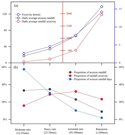 According to Figure 2b, it can be found that the overall contribution rate of rainfall erosivity was ranked as follows: torrential rain > heavy rain > rainstorm > moderate rain. Torrential rain and rainstorms played an important role in triggering water erosion. Rainstorms accounted for only 2% of the erosive rainfall days but contributed to 9% of erosive rainfall and 23% of total rainfall erosivity. Moderate rain in the same period accounted for 58% of the total erosive rainfall days and 33% of the erosive rainfall, but the composition percentage of total rainfall erosivity was only 16%. In this regard, a notable phenomenon was found in Figure 2b: when the rainfall erosivity is higher than the heavy rain, the percentage of the three indicators has changed, that is, the proportion of rainfall erosivity exceeds the proportion of erosive rainfall and erosive rainfall days. The proportion heterogeneity of the three indicators was quite evident in the rainfall intensities over and under heavy rain.