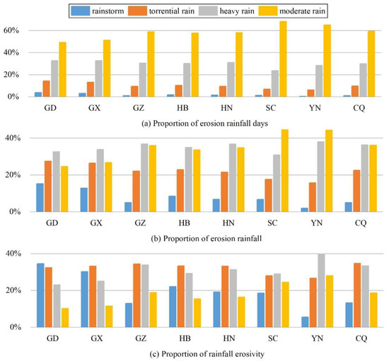In addition, a comparison of rainfall erosion among provinces was also performed (Figure 3). The general characteristics of the 8 provinces were basically analogous, with a small number of high-intensity precipitation events bringing greater erosion risk. Influenced by the regional precipitation features, the asymmetries of Guangdong and Guangxi were particularly prominent; the contribution ratio of torrential rain and rainstorm to rainfall erosivity exceeded 63%, whereas the corresponding proportions of rainy days were less than 18%. Among the eight provinces, Yunnan Province had fewer days of high-intensity rainfall, and the composition of total rainfall and rainfall erosivity mainly depended on heavy rain and moderate rain, with contribution proportions of 82.36% and 67.78% respectively; this was the opposite of Guangdong Province. In general, although water erosion was closely related to the number of rainy days, it was more controlled by a few high-intensity rainfall types, whether for the whole study area or among different provinces.