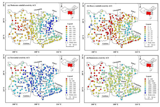 Through the ACI, the inequality features of rainfall erosivity can be intuitively captured. Comparing Figure 4a–d, the ACI of rainfall erosivity represents evident spatial heterogeneity, while no similar pattern of spatial distribution is observed according to the ACI of the four types. In terms of Figure 4a, the highest ACI values are mainly concentered in Hunan Province, and apart from Guangdong Province, the ACI gradually increases from west to east in the study area; this result is basically consistent with the precipitation characteristics of the study area. The spatial distribution of the heavy rain erosivity ACI is relatively complex and shows a pattern of low distribution in the middle area and high distribution on both sides; the opposite pattern appeared in the spatial distribution of the ACIs for the torrential and rainstorm erosivities, which are potentially affected by the intensity of precipitation at each meteorological station. Furthermore, the high ACI distributions of the torrential and rainstorm erosivity in the middle area occupy most of the study area, while the lowest ACI values are mainly distributed in the northwest area with less annual rainfall and extreme daily precipitation events.