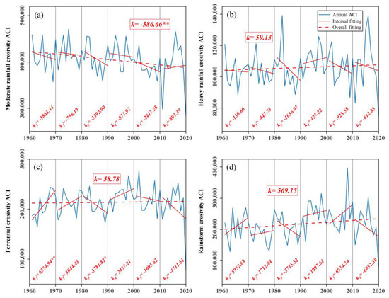 Insignificant increasing trends were found in the heavy rainfall erosivity ACI, torrential erosivity ACI, and rainstorm erosivity ACI of the whole study area during the past 60 years (Figure 5). The moderate rainfall erosivity ACI showed a significant decreasing trend at a rate of −586.66/yr (p < 0.05). From the perspective of these trends, the ACIs of the torrential and rainstorm erosivity were generally consistent with the interannual change, while the remaining two were comparatively different. Compared to the linear change rate of the four types of ACI, the increase in the rainstorm erosivity ACI was obviously the largest, indicating that the risk of asymmetric erosion would continue to rise quickly over time.