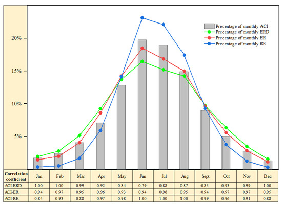 Monthly distribution of the ACIs, erosive rainfall days (ERD), erosive rainfall (ER), rainfall erosivity (RE), and their correlation coefficients (p < 0.01).