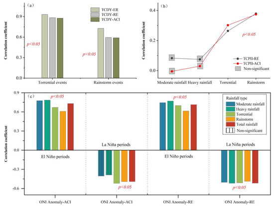 (a) Pearson correlation coefficient between the typical tropical cyclone daily precipitation (TCDY) and erosive rainfall (ER), rainfall erosivity (RE) and ACI, (b) relationship between the tropical cyclone precipitation impact index(TCPII) and RE, ACI of Guangdong Province, (c) relationship between the Oceanic Niño Index (ONI) anomaly and RE, ACI during the period of ENSO.