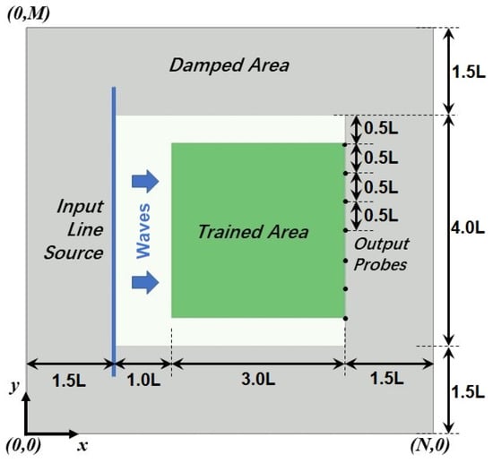 The wave field modeled is a rectangle with a square trained area inside. The grid size is selected as , such that N = M = 280. Seven default output probes are placed on the right edge of the trained area. Additional probes can be freely added in any location within the wave field based on research or design purpose. Other detailed sizes are presented in Figure 1.