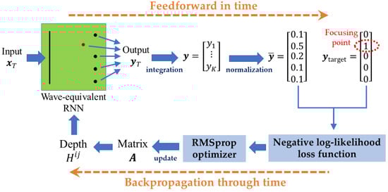 Further applying spatial discretization to Equations (5) and (6), the hidden state becomes a vector whose components are the discretized values of in the wave field. Then, a wave-equivalent RNN model can be developed based on Equations (5) and (6) to represent a physical wave system.