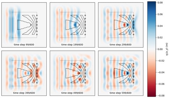Wave directing is achieved through different wave dynamics, such as reflection and refraction. Different wave-focusing bathymetry can be obtained by changing the arrangement of output probes and the selection of the focal point out of the probes. Six different cases are studied using the proposed RNN approach in this section, revealing the directing effects of reflection and refraction of shallow-water waves. Both the simplified shallow-water wave equation (Equation (9)) and the hyperbolic mild-slope equation (Equation (11)) are used to develop the equivalent RNN models for training.