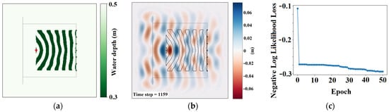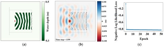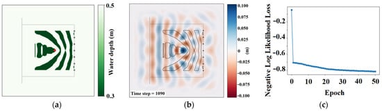 Figure 3 shows an example of the overall workflow for the proposed method. In each training epoch, the training process includes the following steps: (a) a regular incident shallow-water wave is generated by a series of inputs and propagates over the varying bathymetry for 20; (b) the time histories of surface elevation at the output probes are integrated for the last 14 and normalized to compute the relative wave energy distribution among output locations; (c) the negative log-likelihood loss function and RMSprop optimizer are invoked to compute the loss value and update the pseudo water depth for the next epoch.