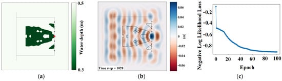 Results of the third case from the equivalent RNN model of Equation (9) (learning rate = 0.9): (a) optimized bathymetry with probes; (b) snapshot of wave elevation; (c) loss values of training.