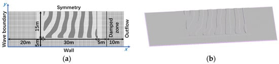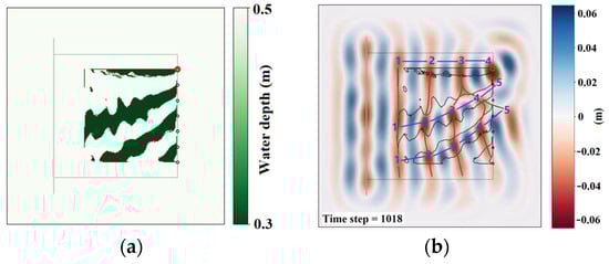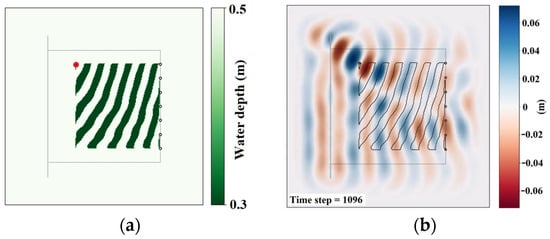 The incident wave height is set to 0.05 m ( = 0.025 m) and water depth can vary between 0.5 m to 0.3 m in the trained area ( = 0.3 m, = 0.2 m), which are also applied to the other five cases in this section. To eliminate the reflection from the boundaries, the damping coefficients of each grid are computed using Equation (27):