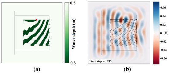 Results of the fourth case from the equivalent RNN model of Equation (11) (learning rate = 1.2): (a) optimized bathymetry with probes; (b) snapshot of wave elevation.