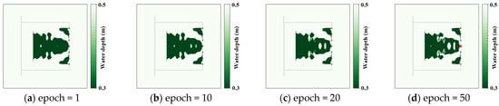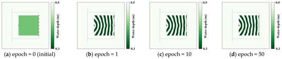 We set as the initial condition for the wave field. Because the pseudo water depth is initially set to zero in the trained area and 1 × 108 in other areas, the initial water depth is in the trained area and otherwise.